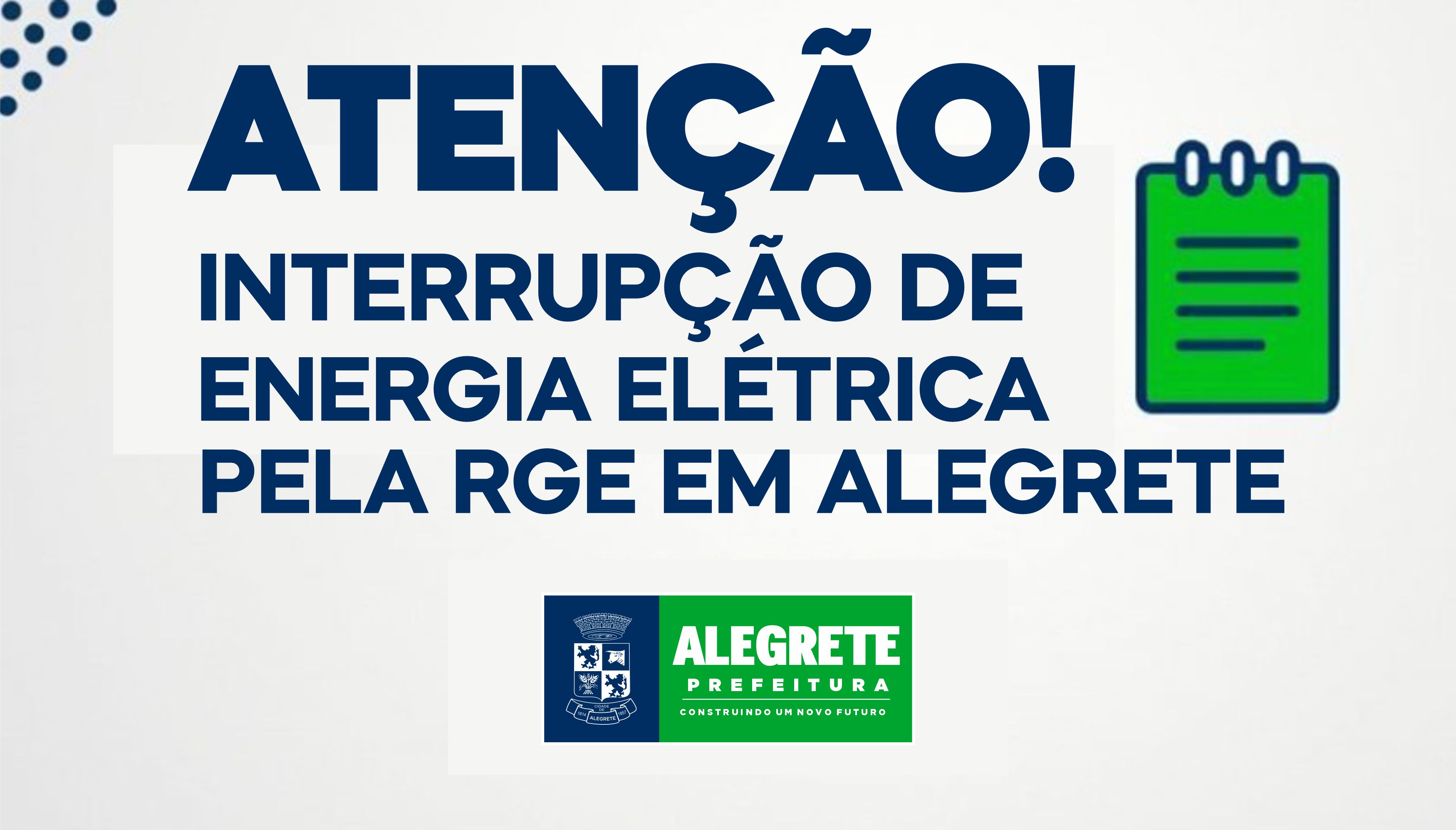 A RGE comunica que haverá interrupção no fornecimento de energia elétrica, devido a manutenção e melhorias, o que afeta algumas regiões do município de Alegrete entre os dias 06 e 09 de março. Confira os períodos e locais onde haverá interrupções nos links a seguir: